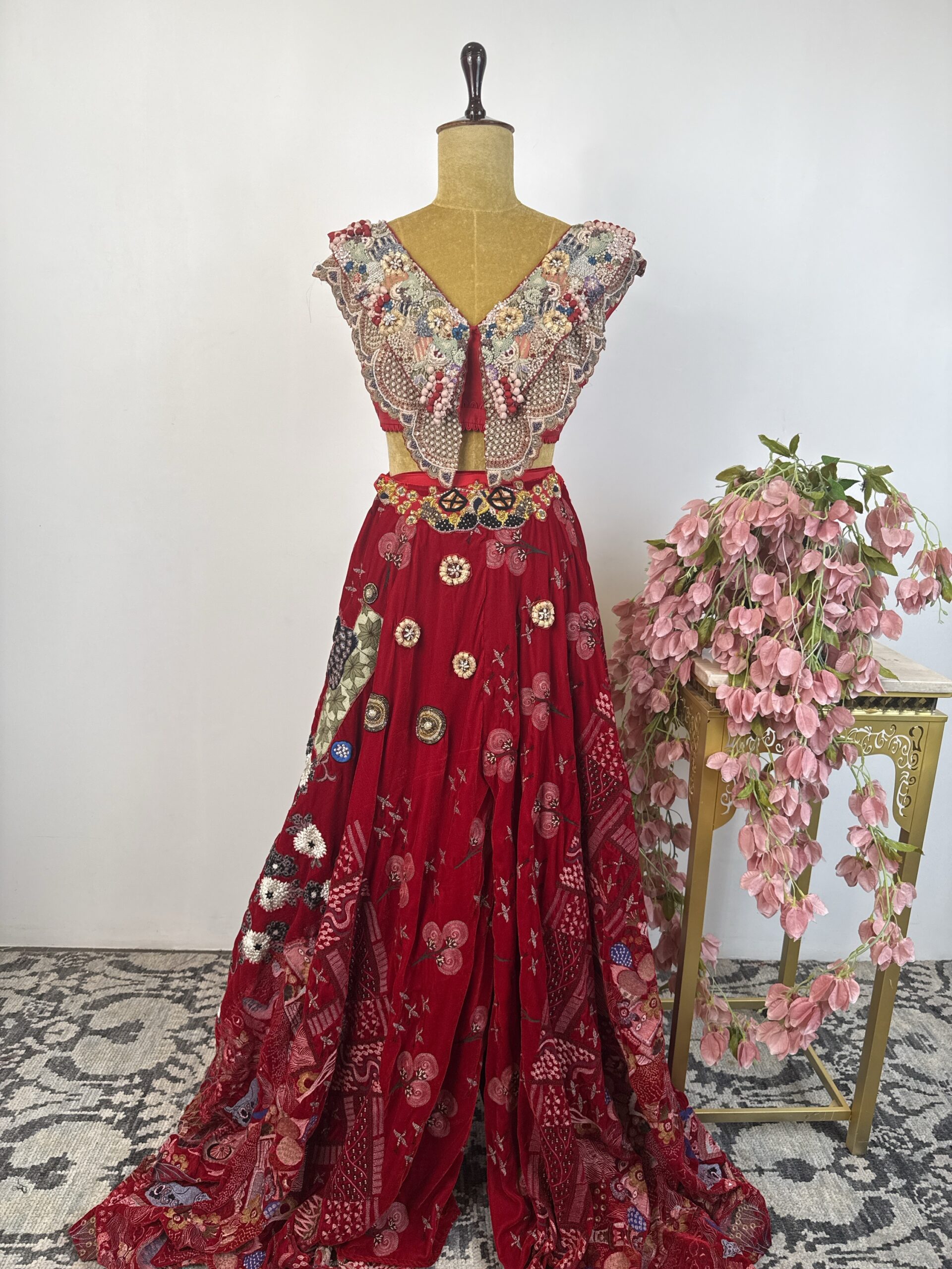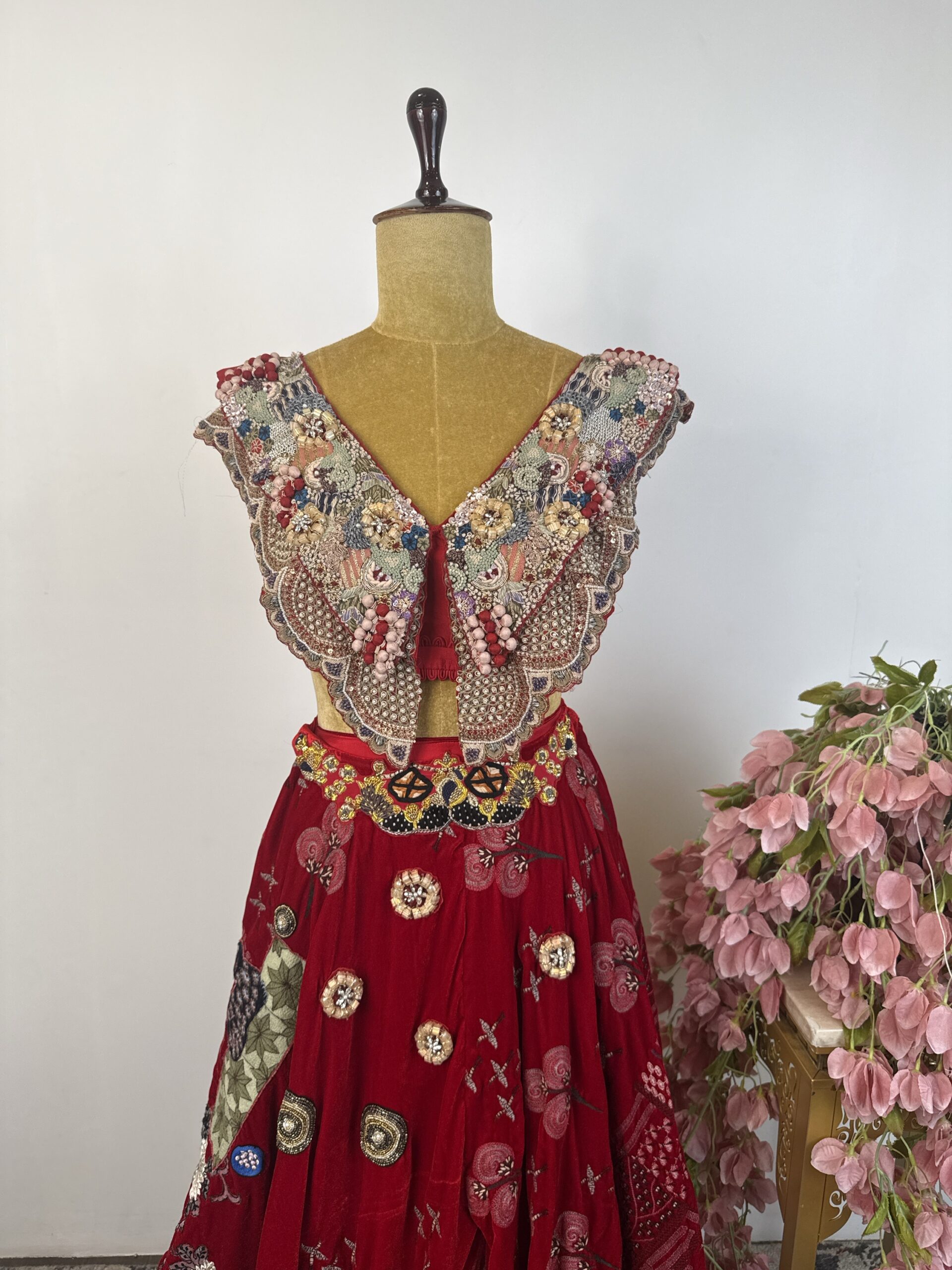 Luxurious velvet flared pants paired with a blouse detailed in hand-done thread and pearl work.