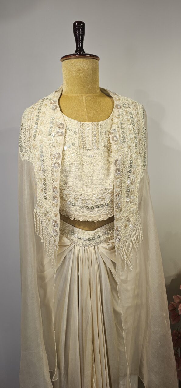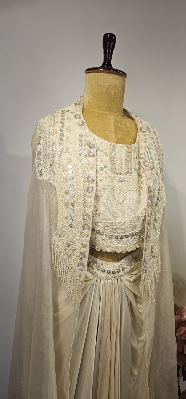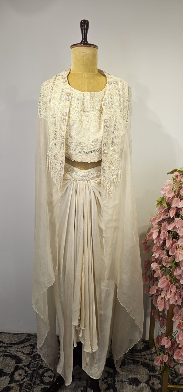White colour drape skirt and it comes with short top with beautiful hand done pearl embroidery on the top and for cape