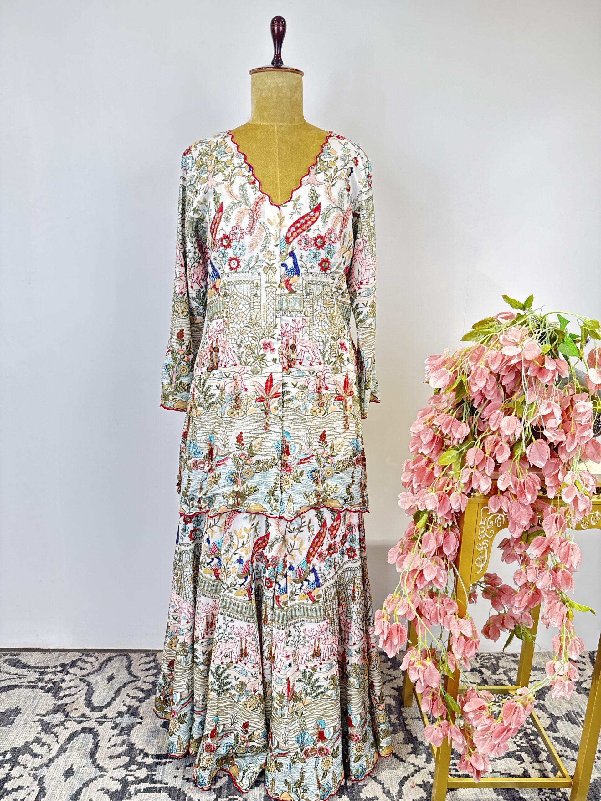 Beautiful white colour jacket with flared pants embroidered with animal and floral motifs with contrast threads and highlighted with beads