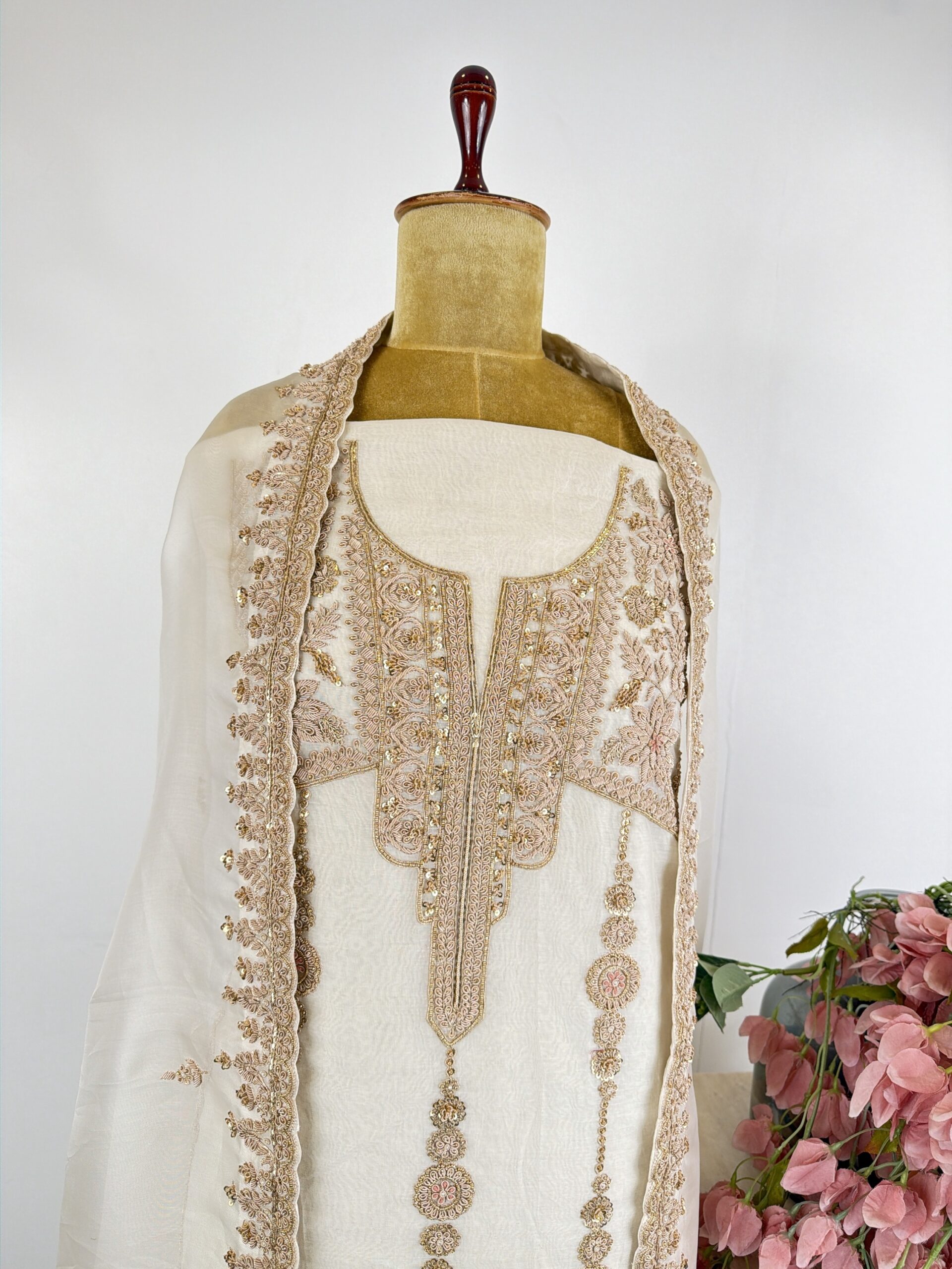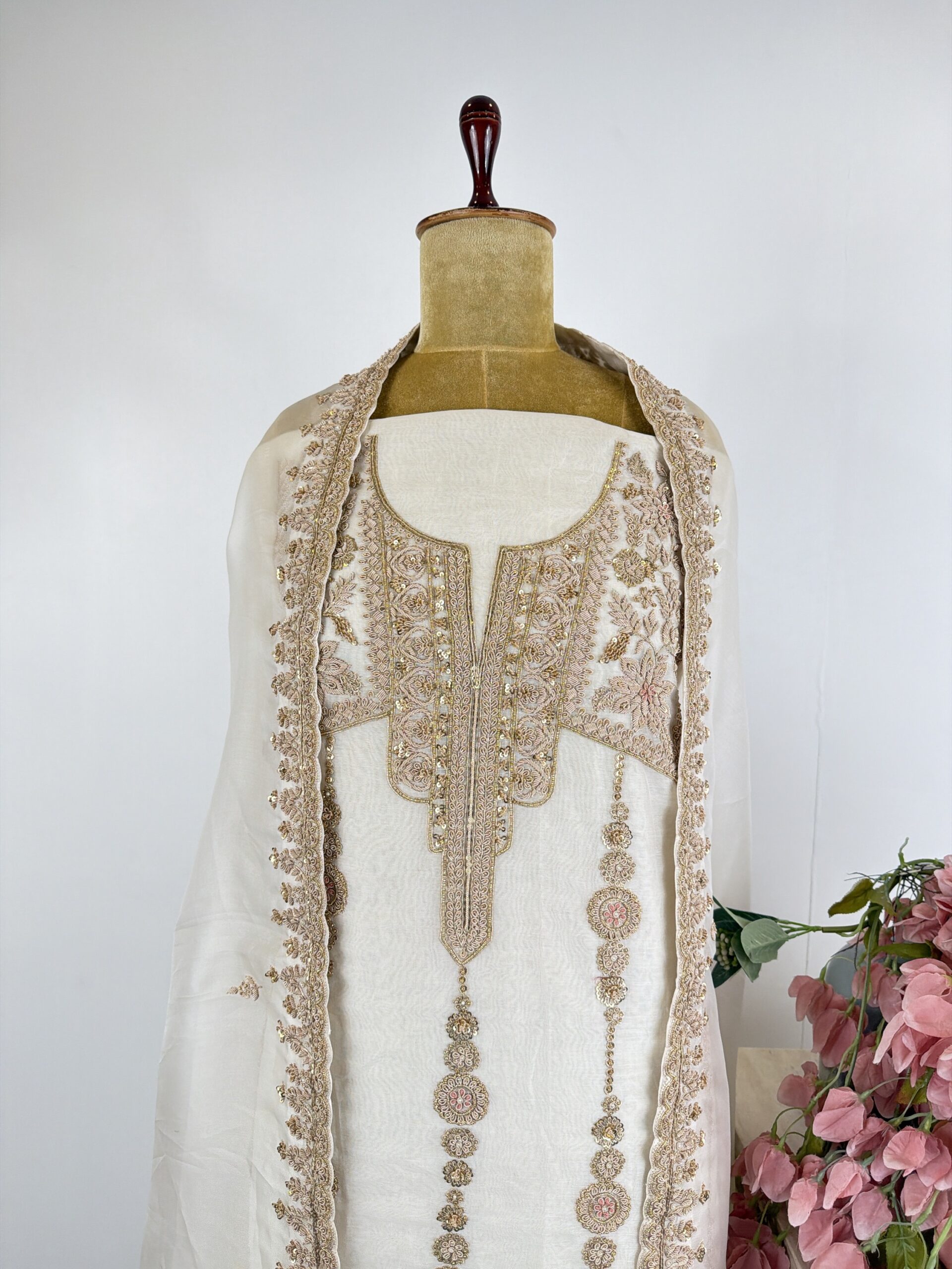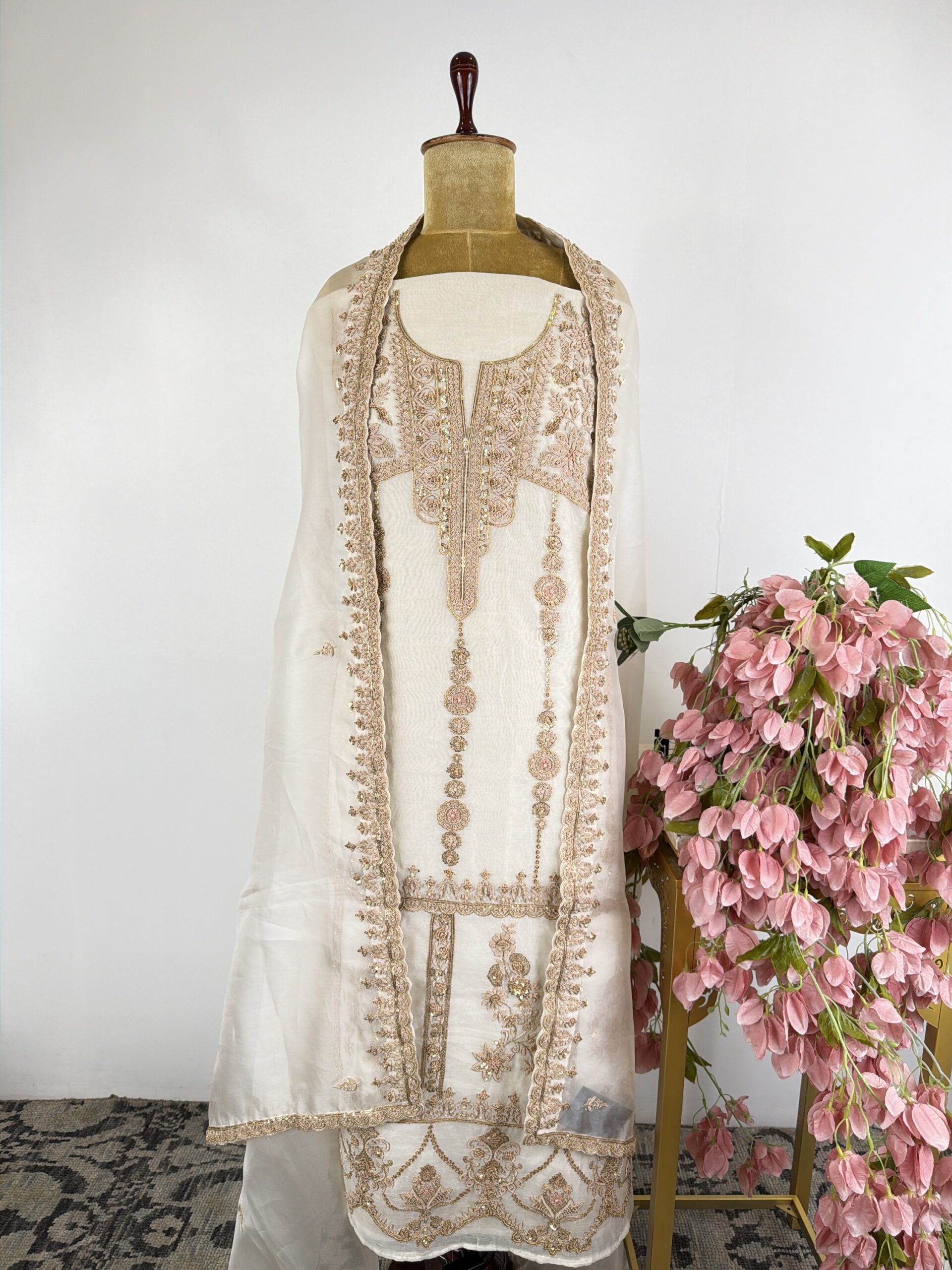 White colour organza unstitched suit with zardosi and sequins hand done embroidery paired with dupatta and bottom