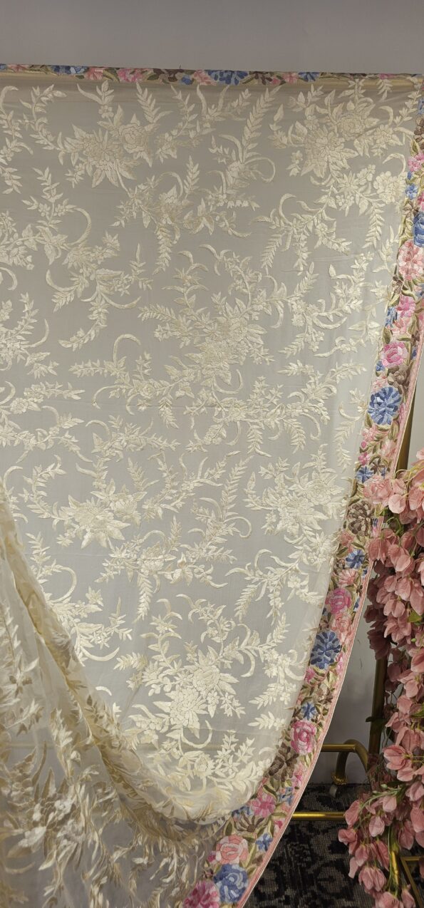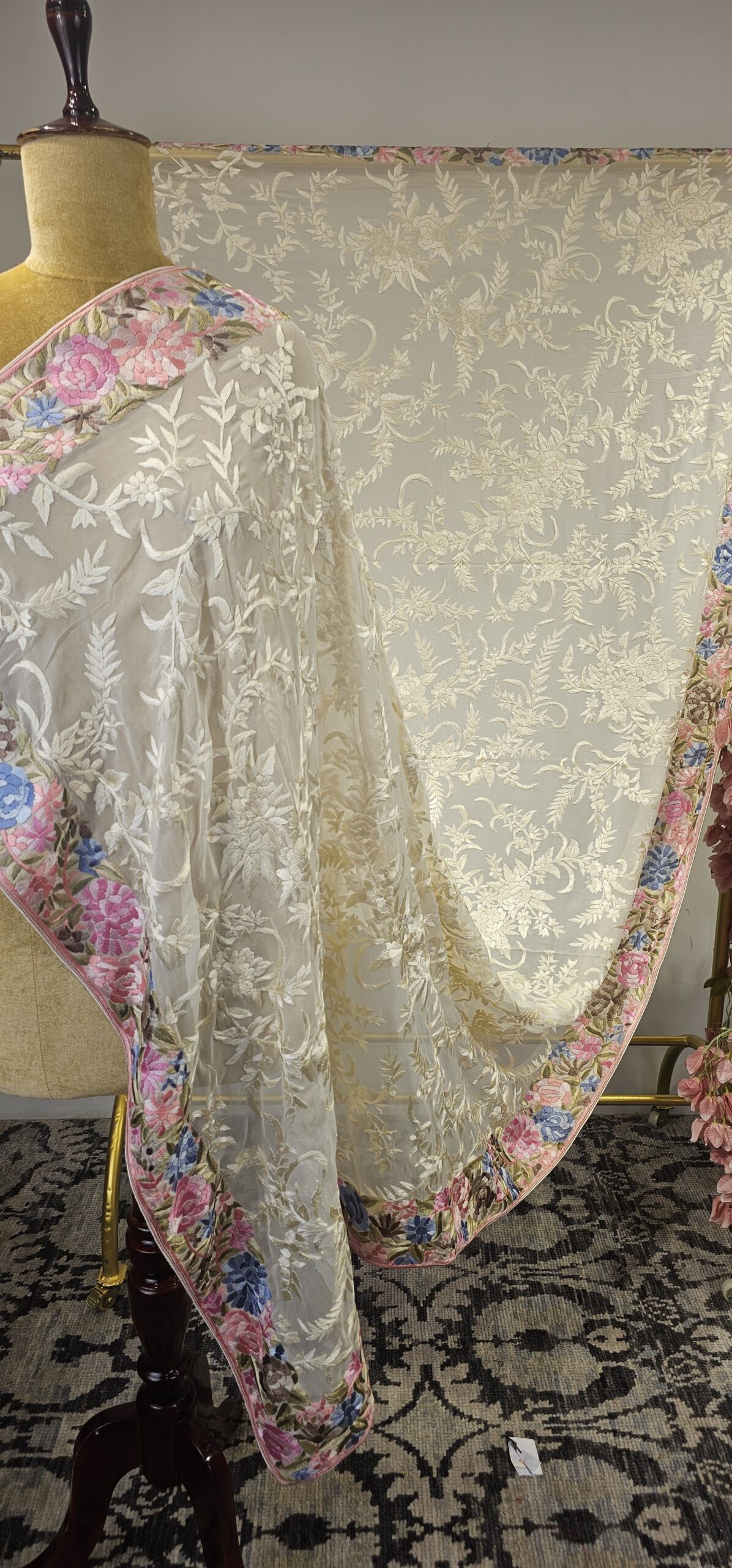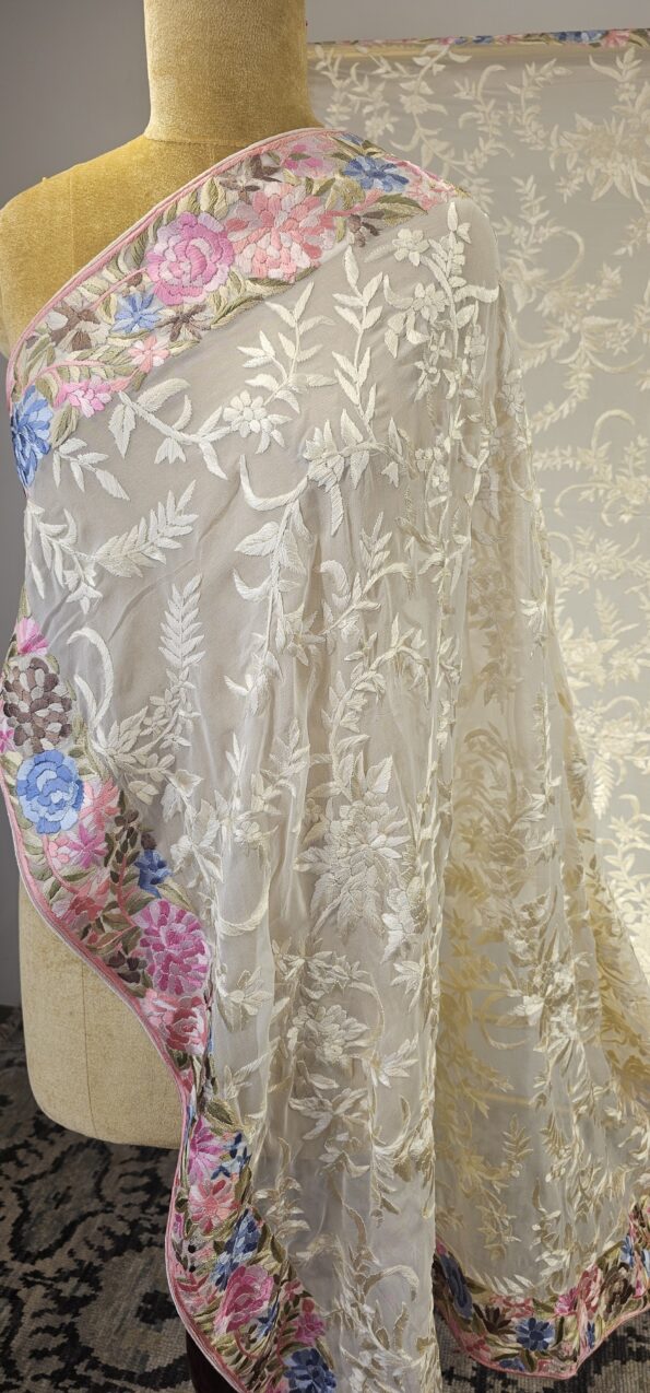 White georgette parsi gara duppatta with beautiful mutli color motifs.