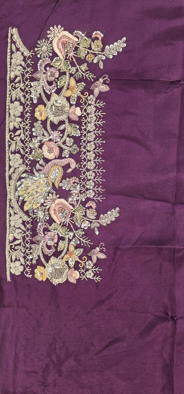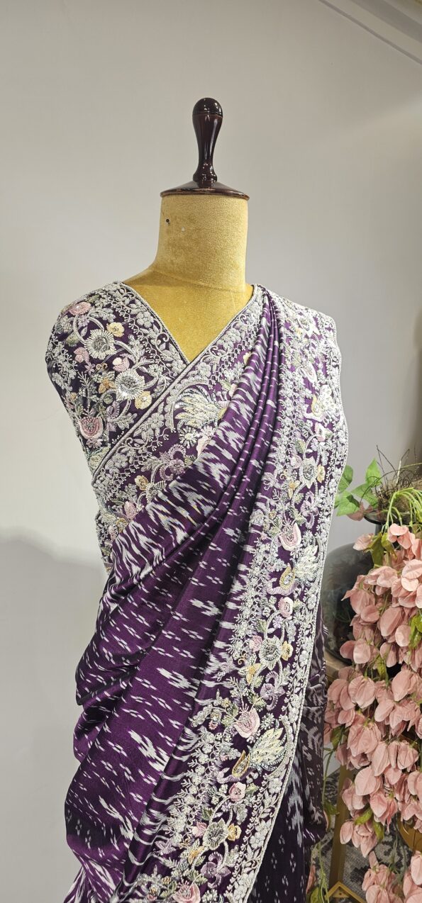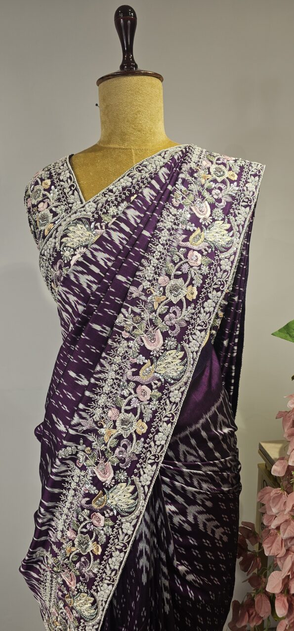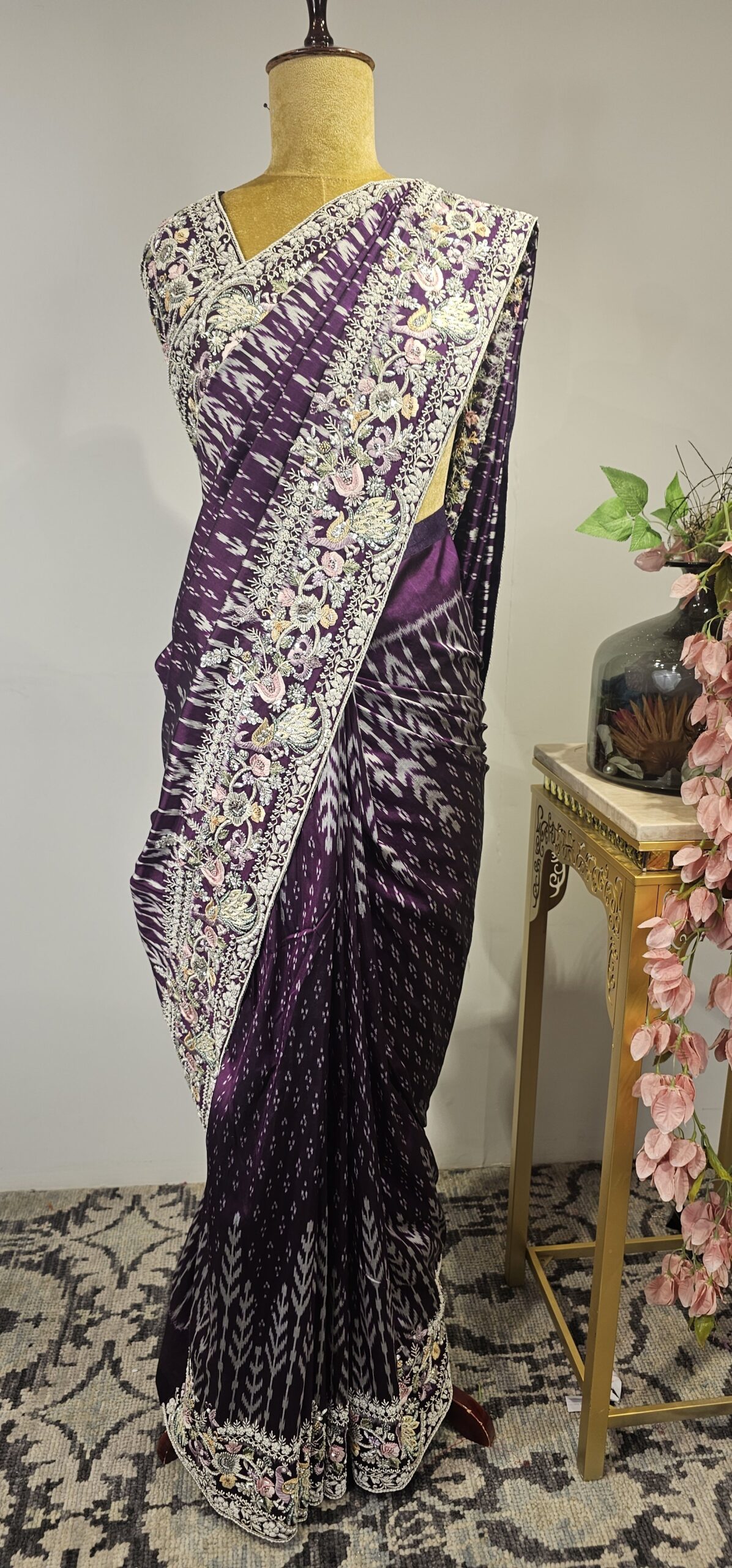 Wine colour Ikat saree with beautiful hand done zardosi and thread work border all over the saree and palla