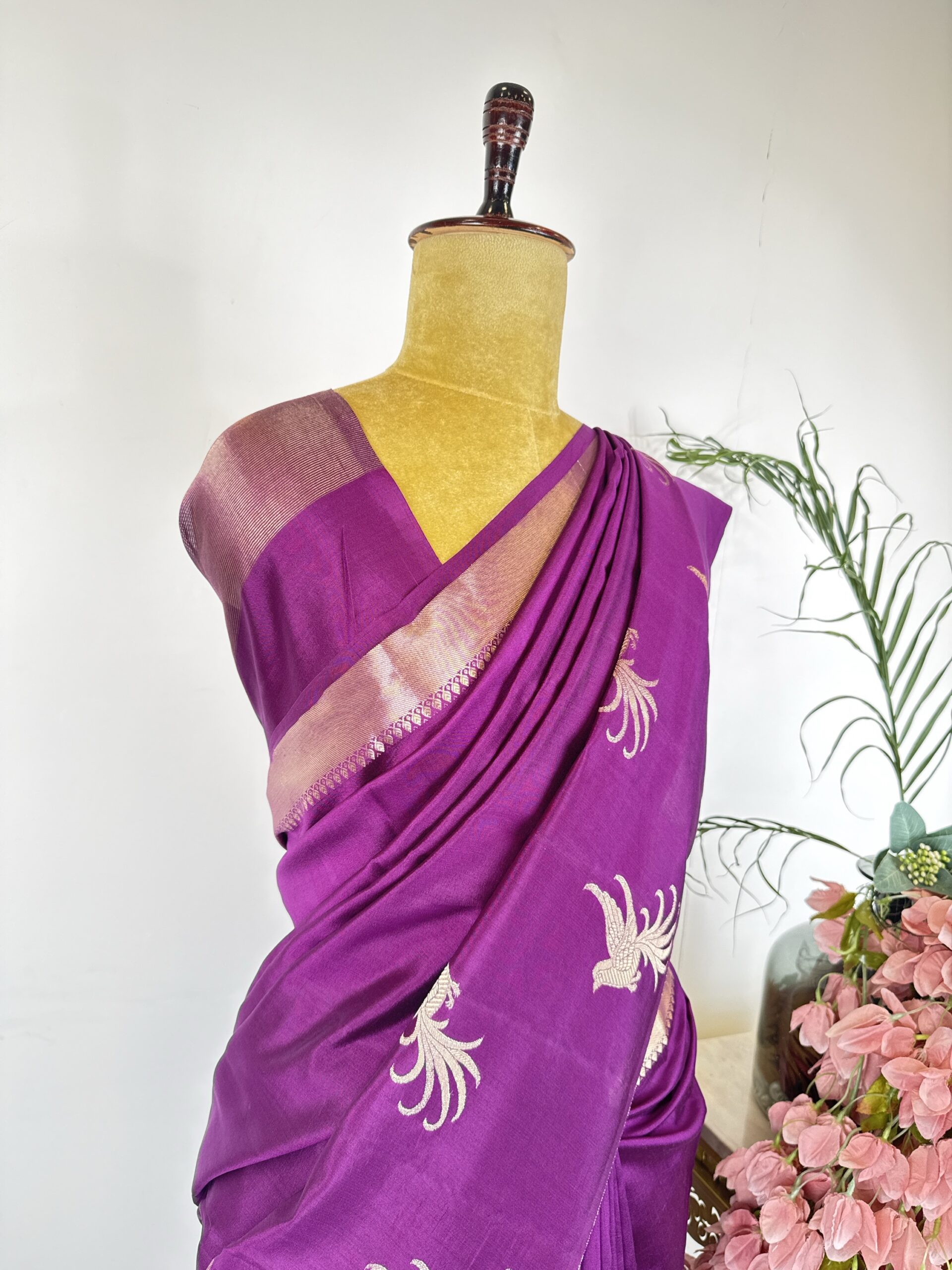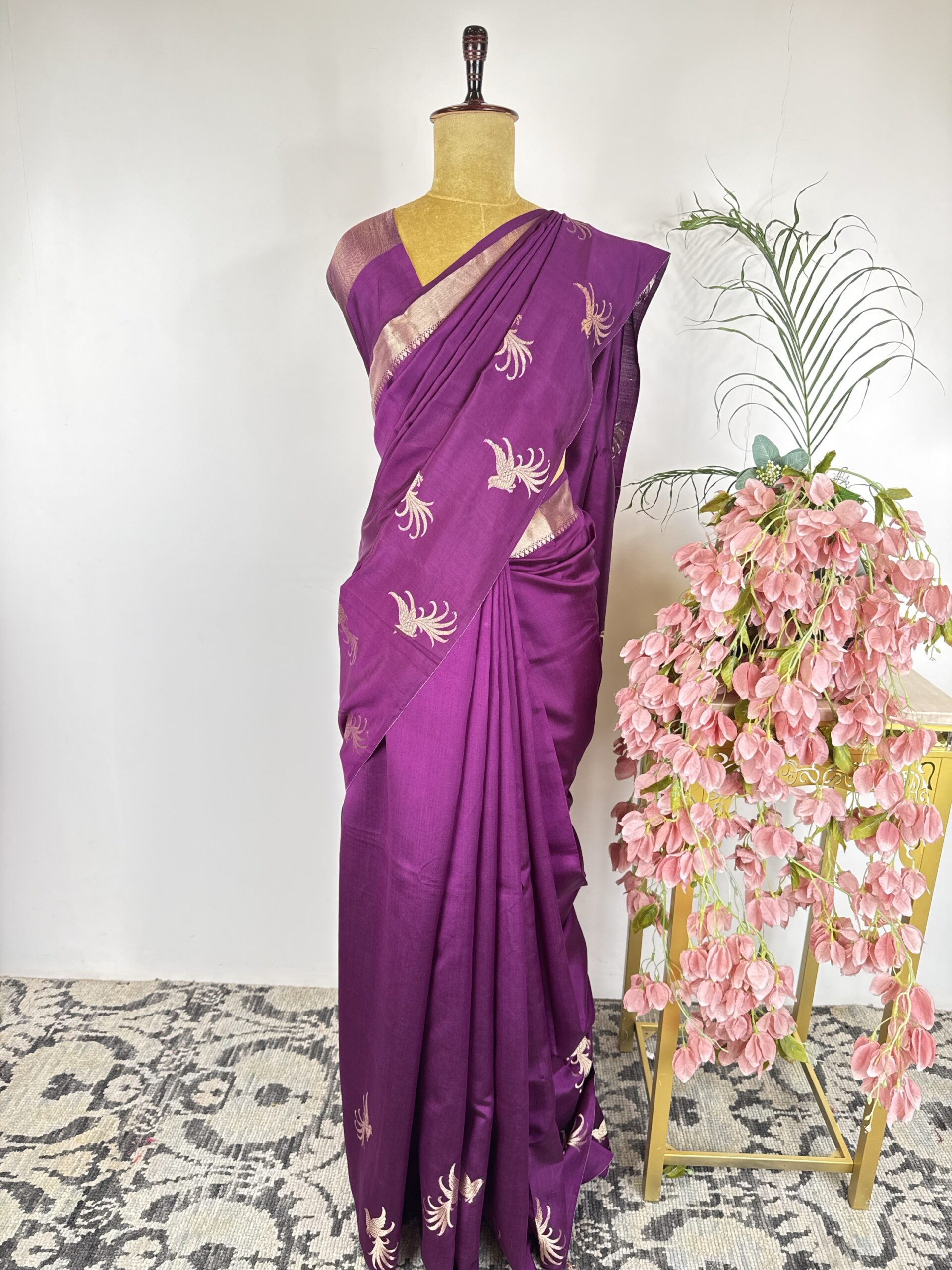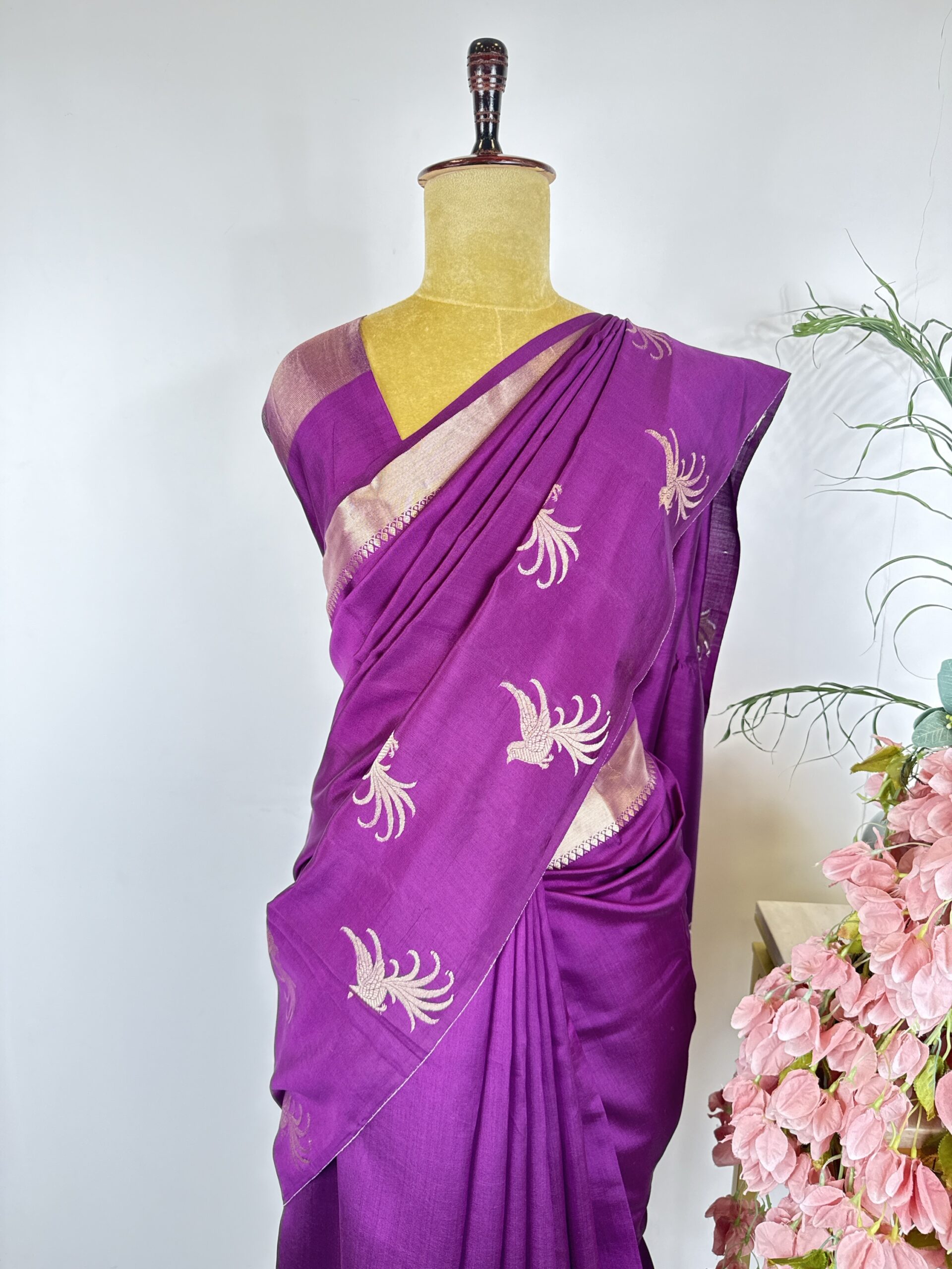 Wine colour raw mango saree with birds motifs in the border