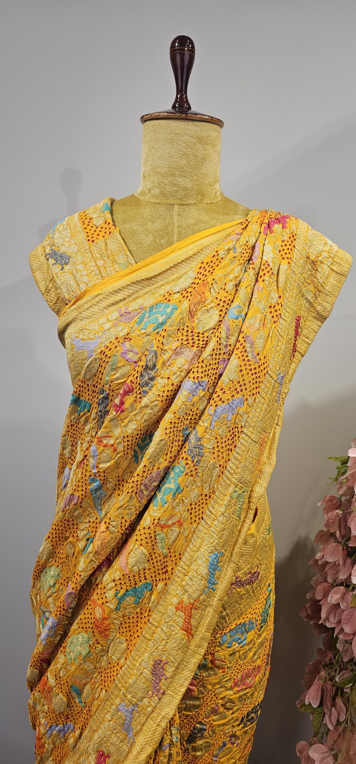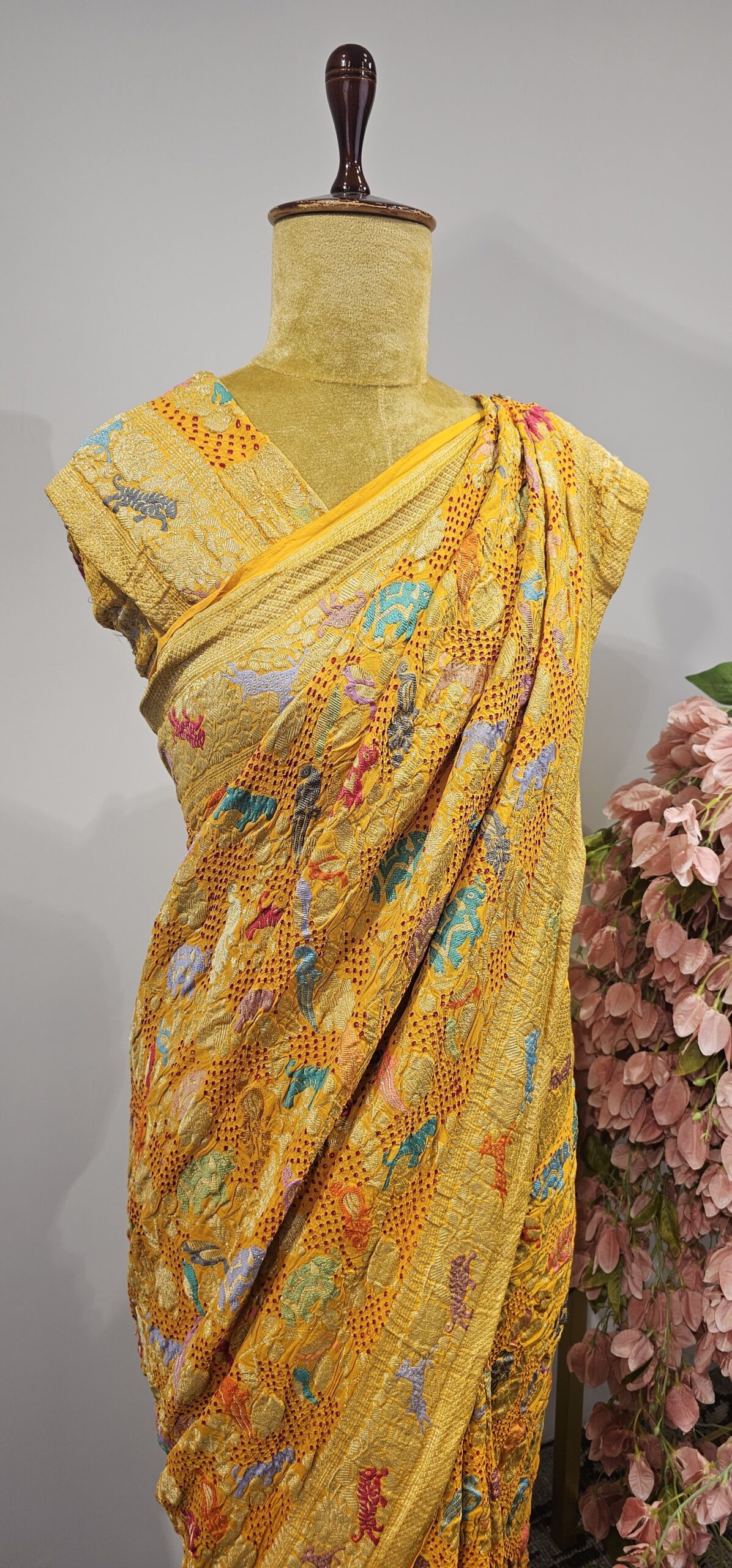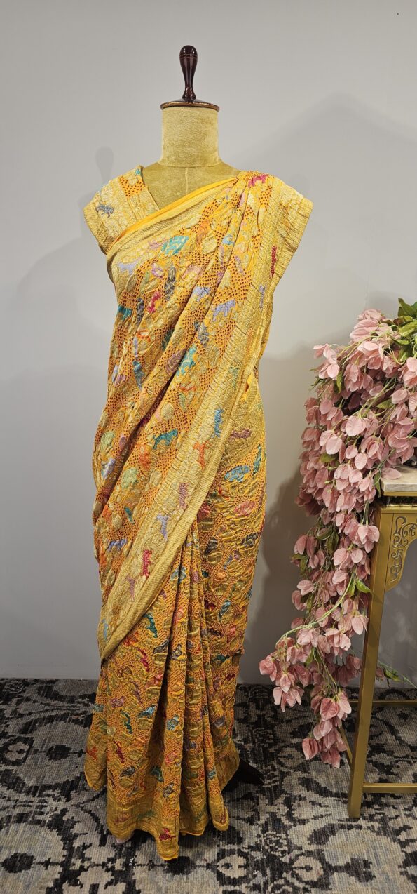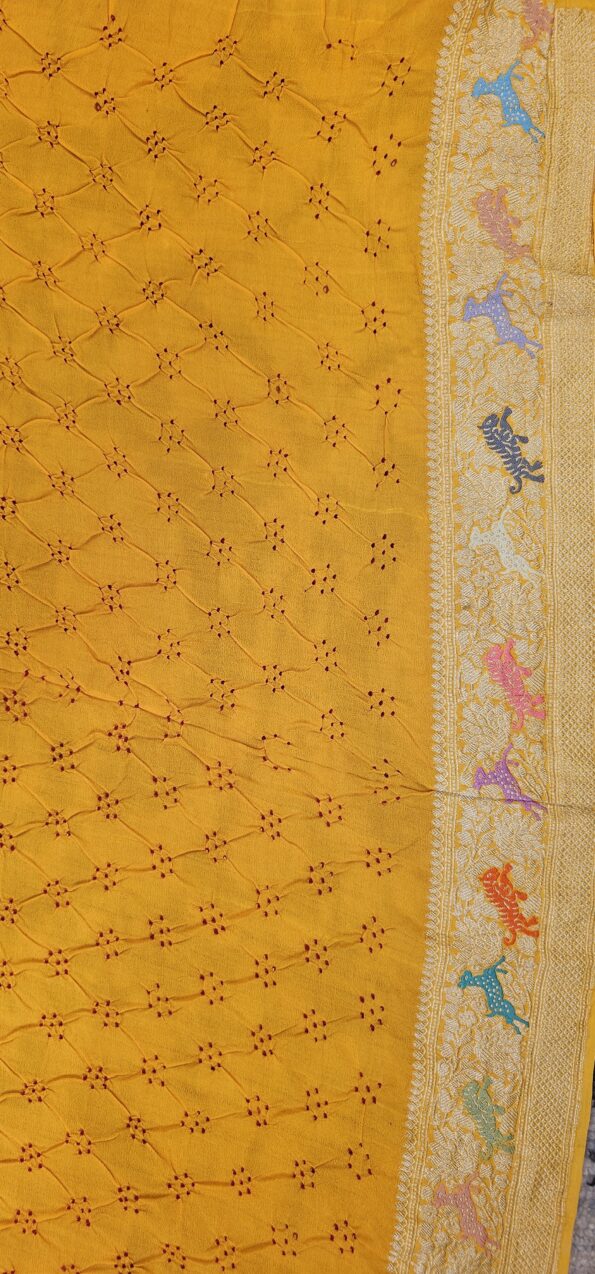 Yellow colour bandhani saree with Shikara concept in meenakari and Zari weave