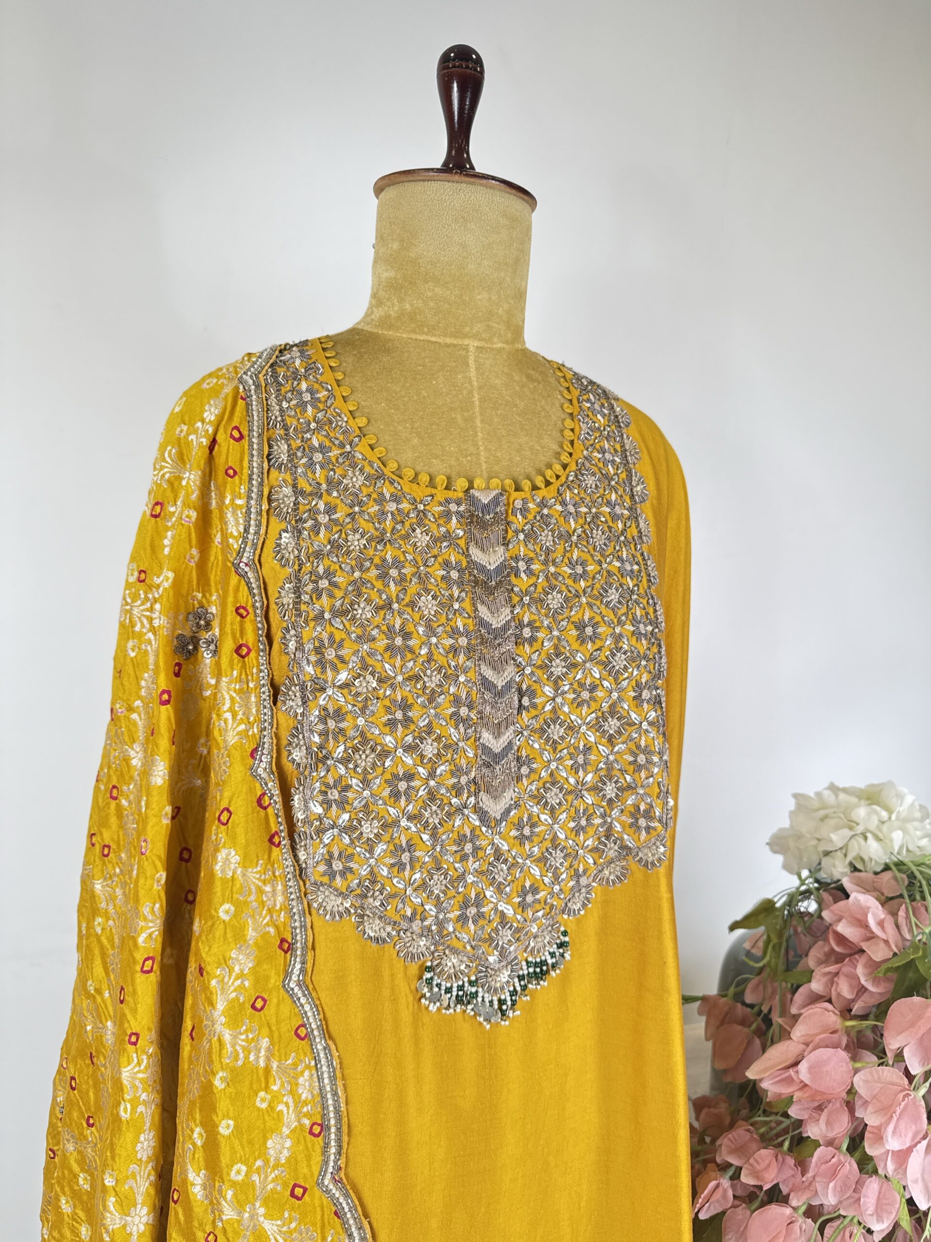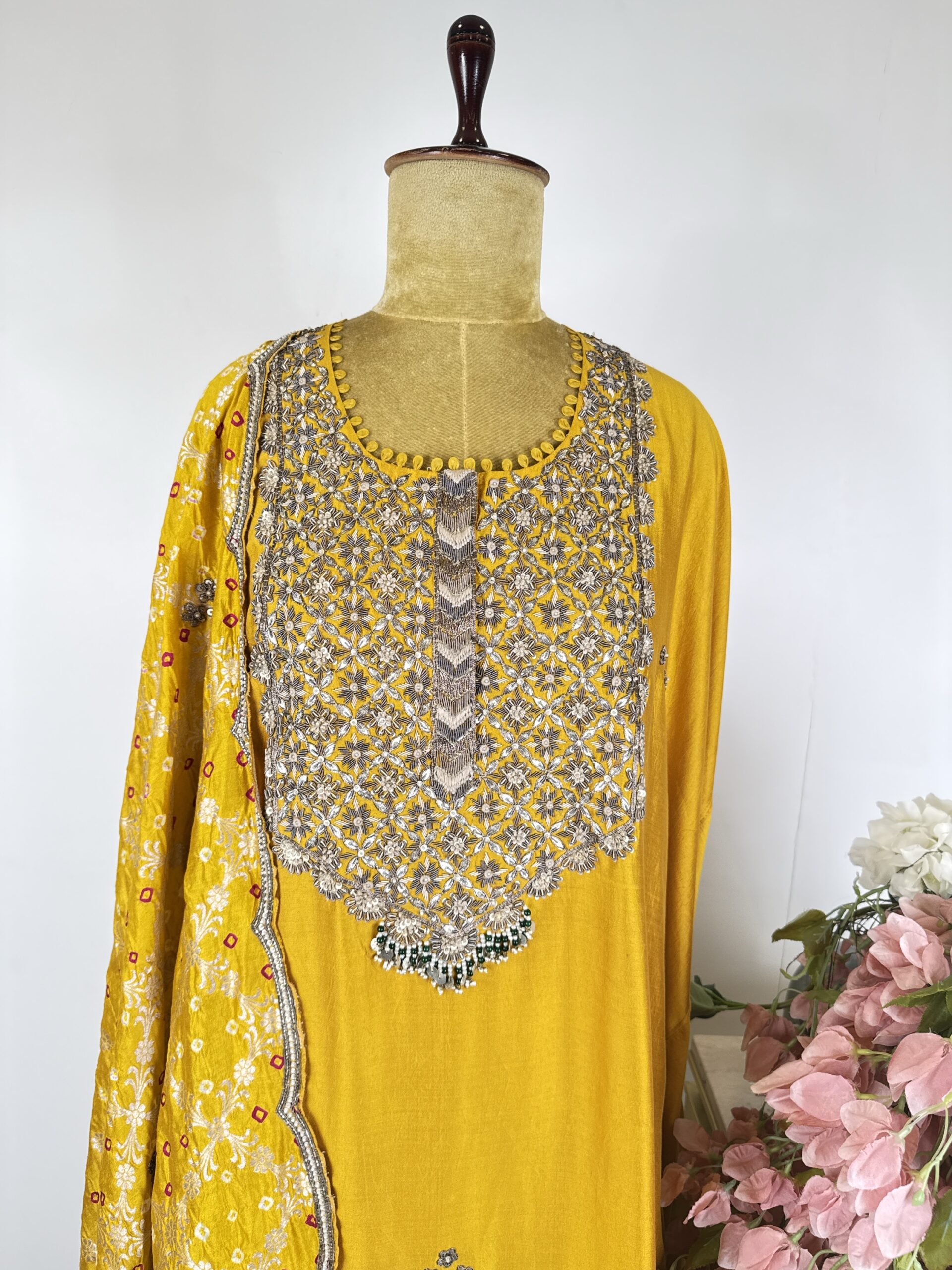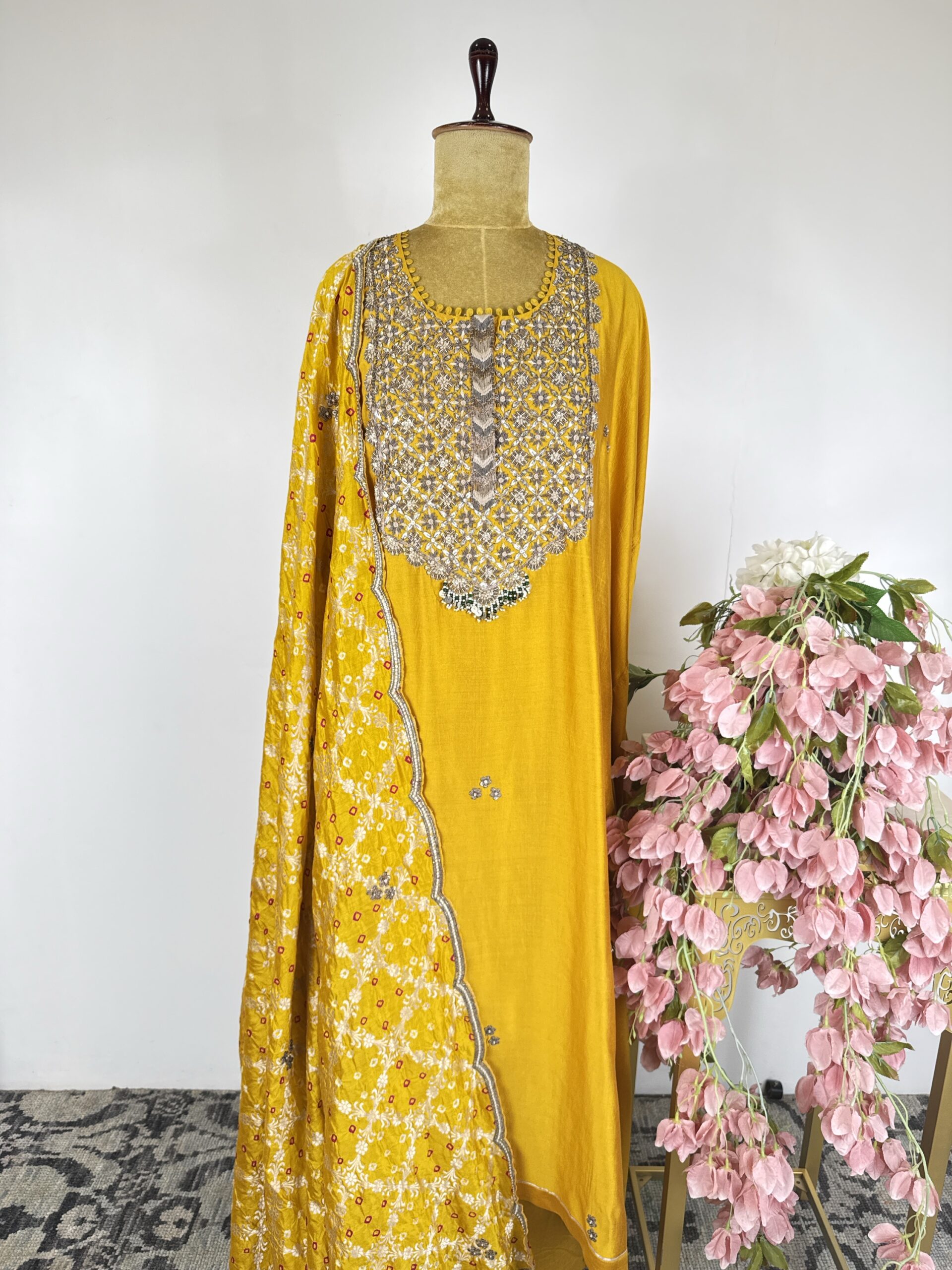 Yellow colour semi stitched suit hand embroidered neck line with zardosi and pearl and paired with bottom and Bandhani dupatta with embroidery motifs