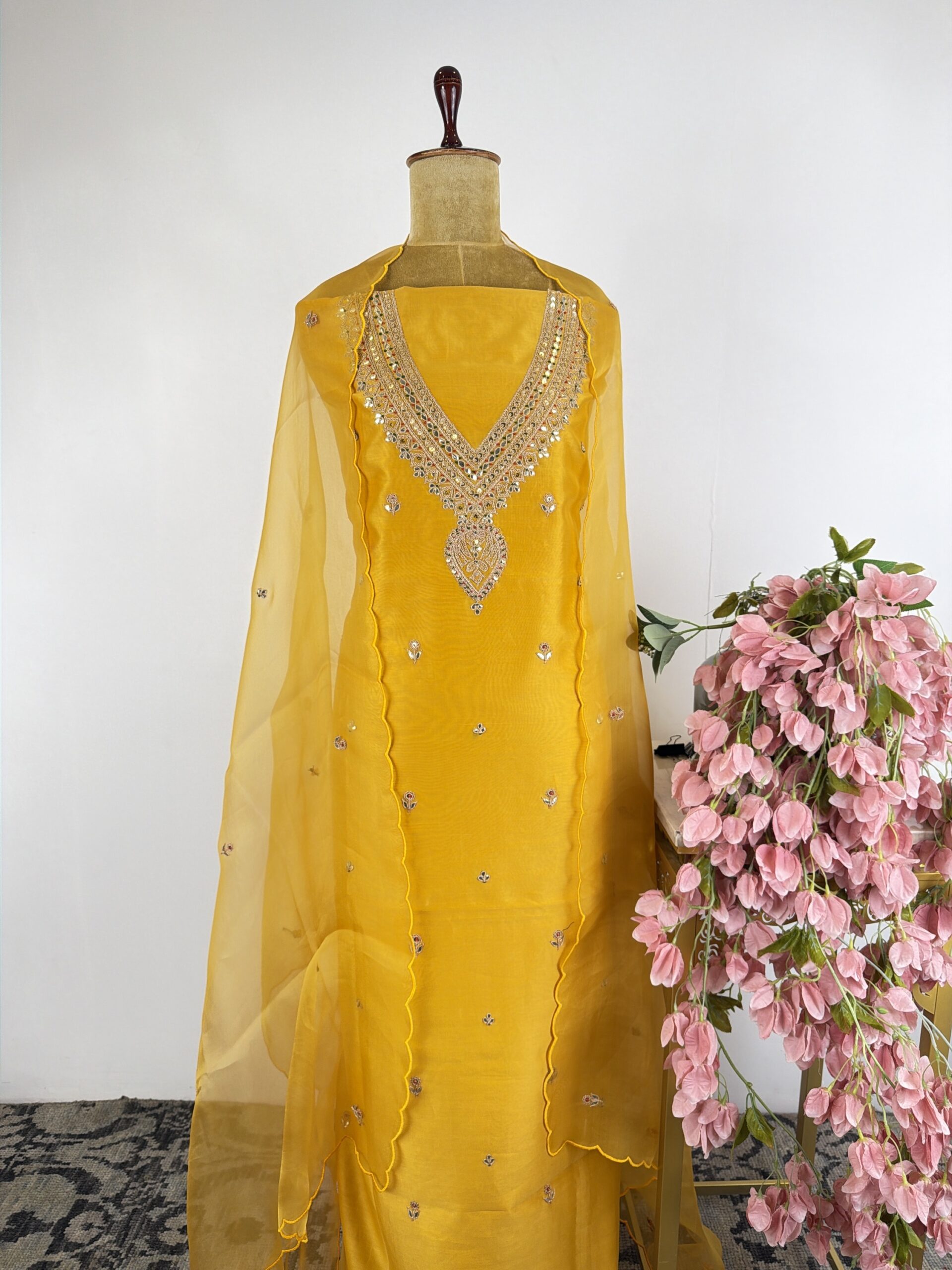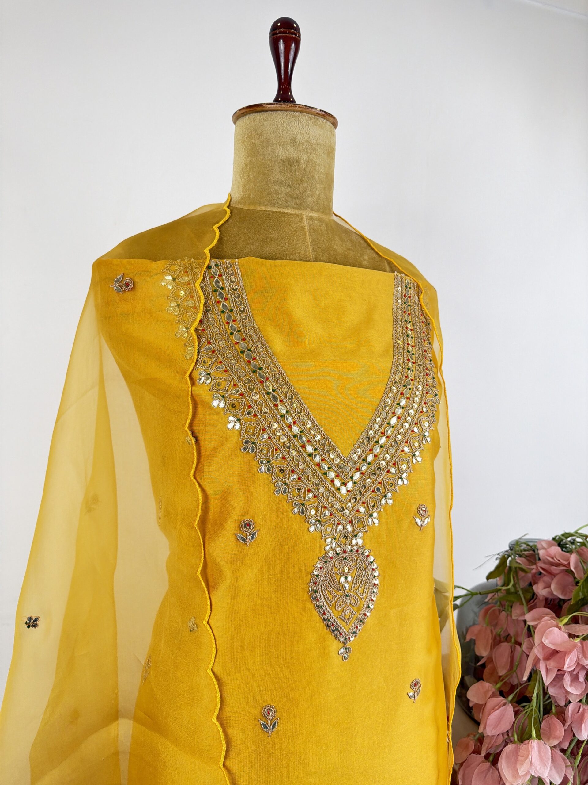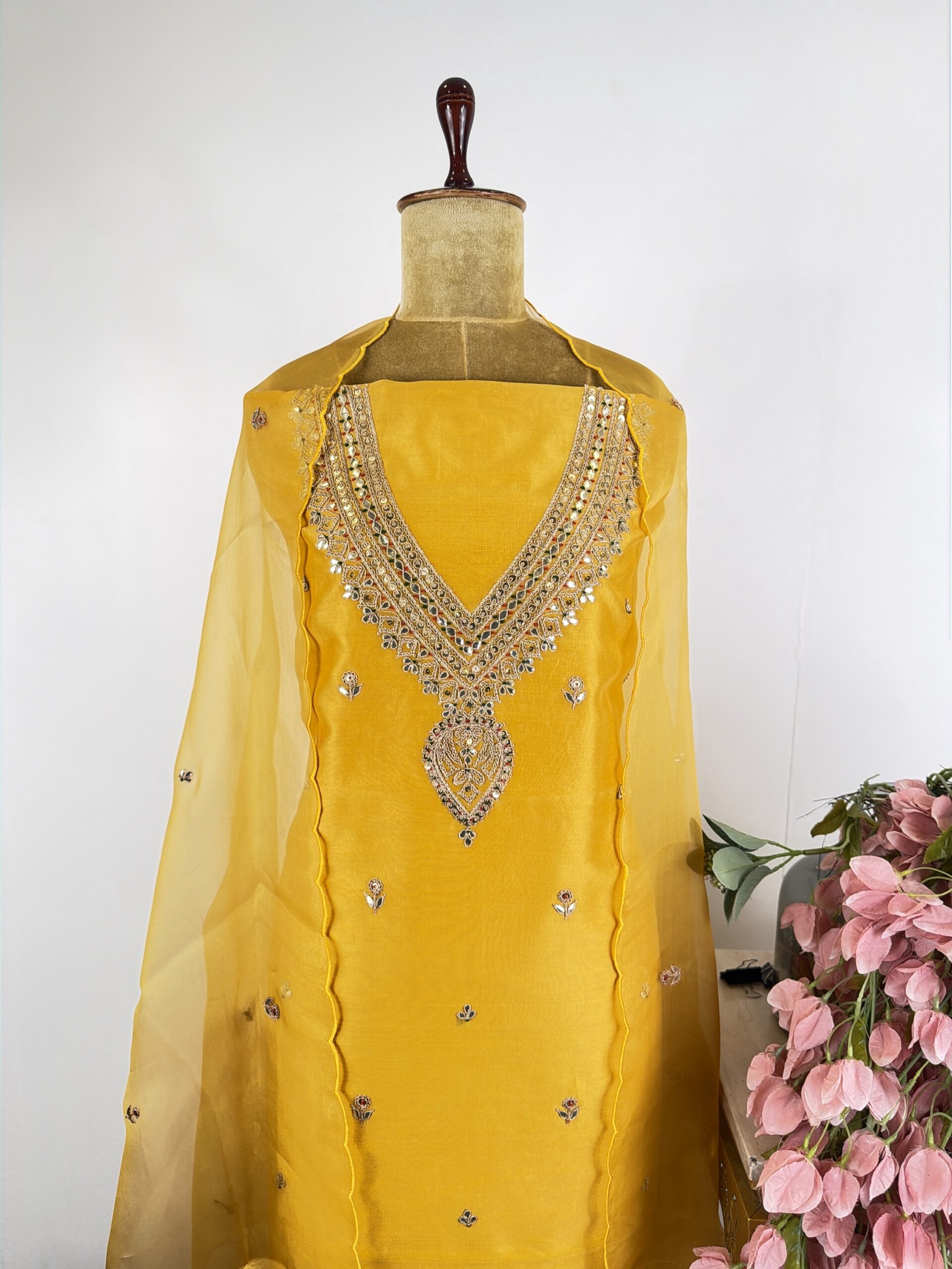 Yellow colour Chandheri unstitched suit with floral motifs detailed with gota Patti paired with organza dupatta and bottom