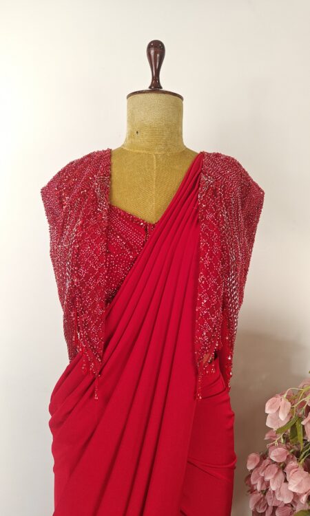 Crimson red drape saree with embroidered jacket